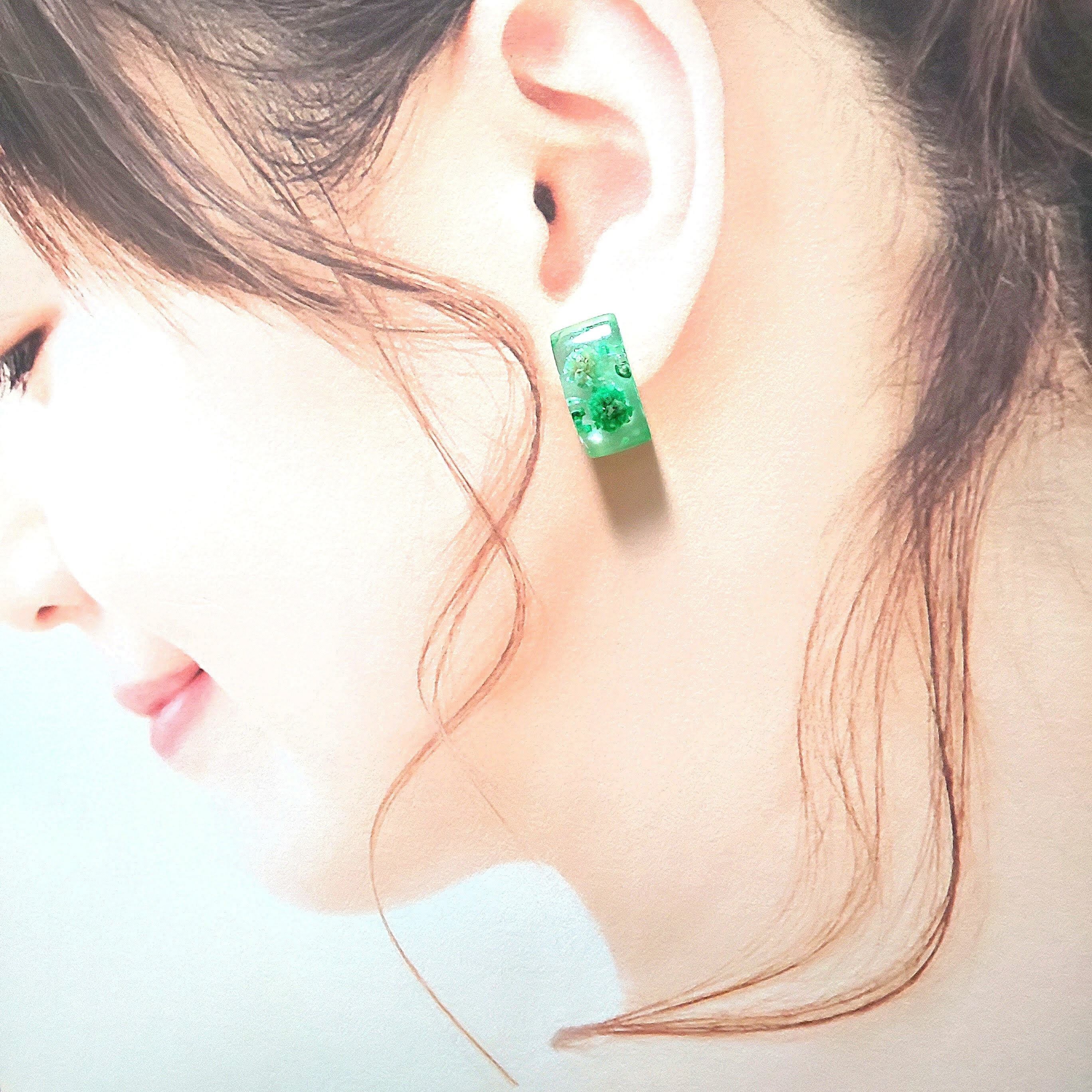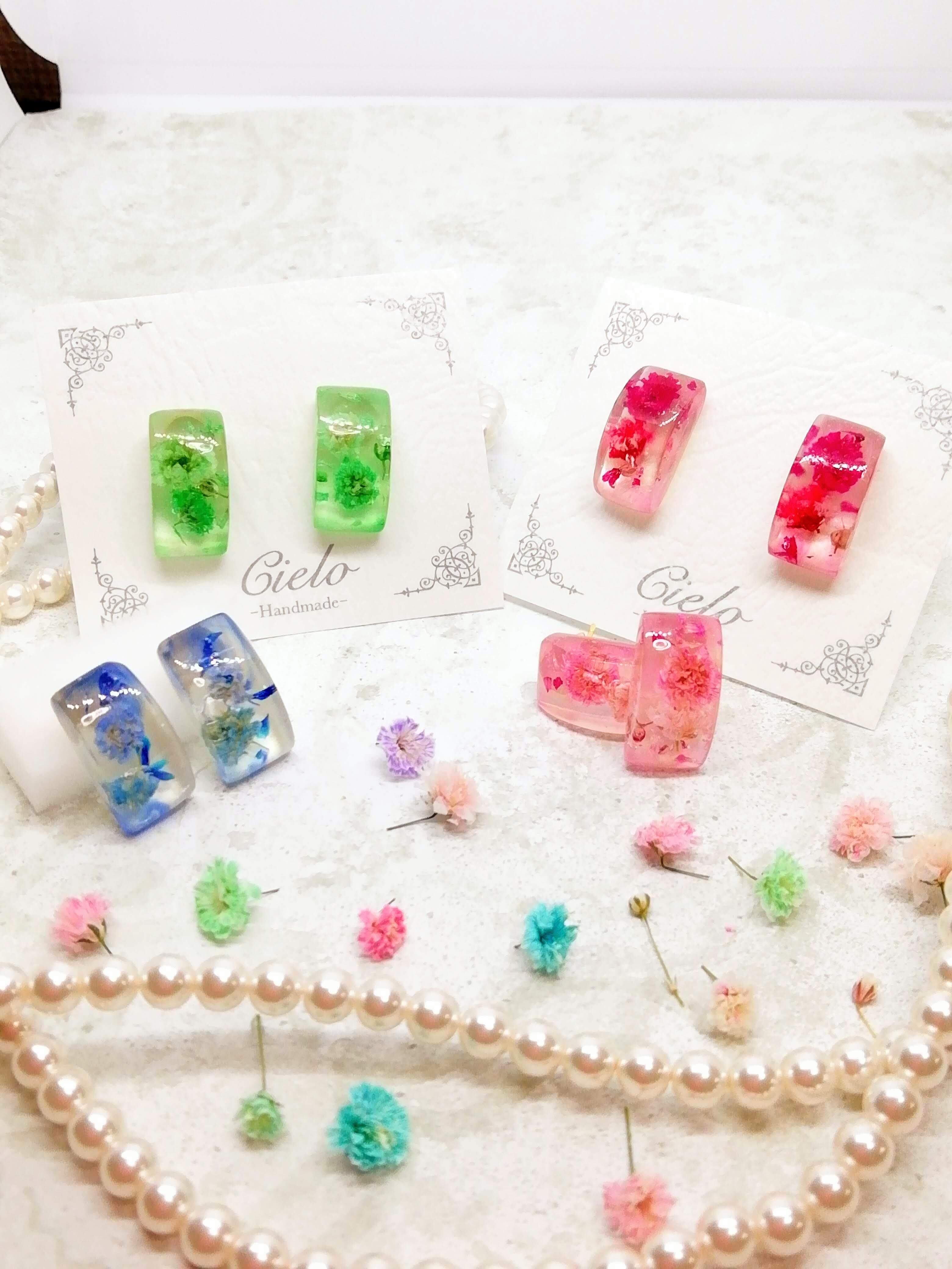 パステルカラーのかすみ草を閉じ込めた耳飾りです。