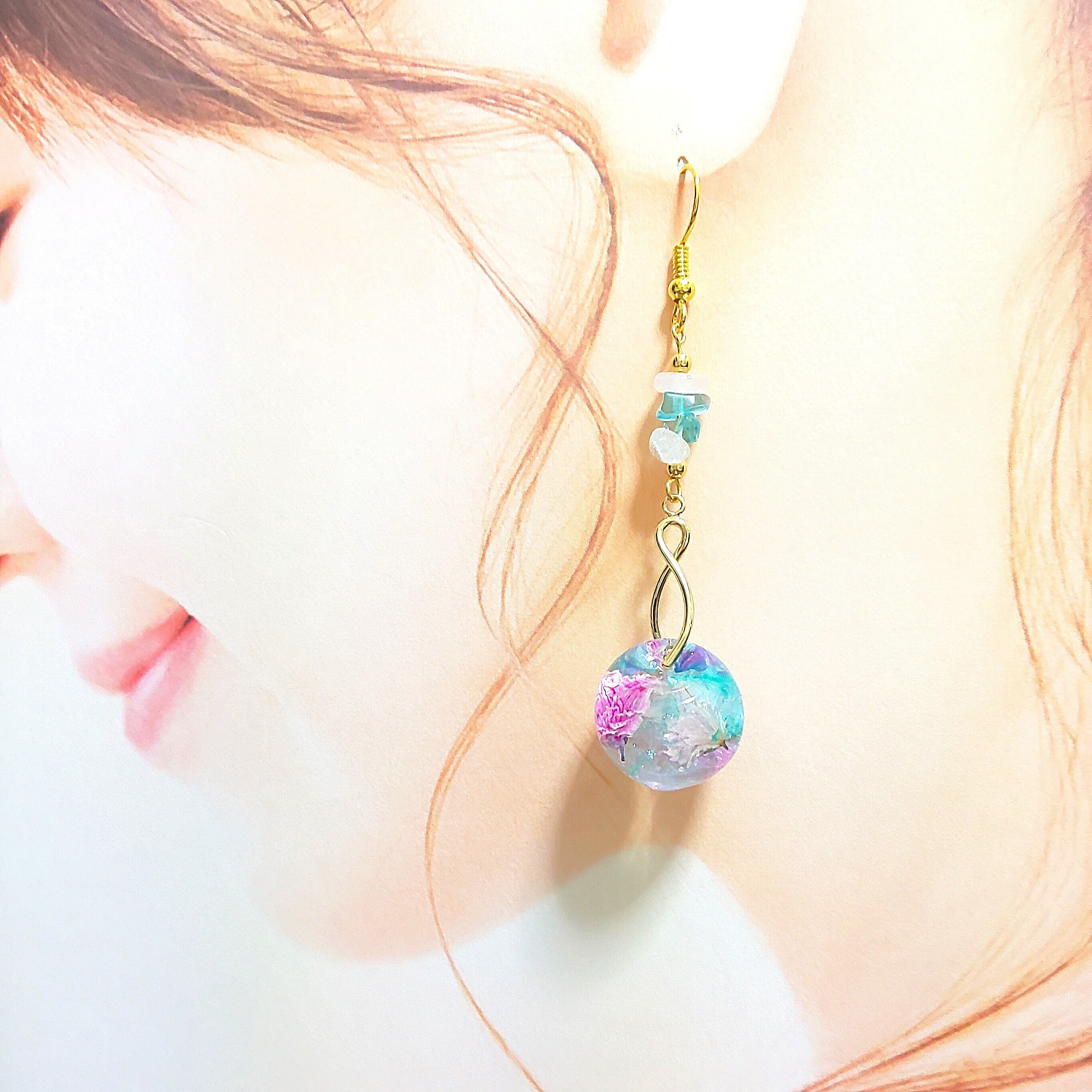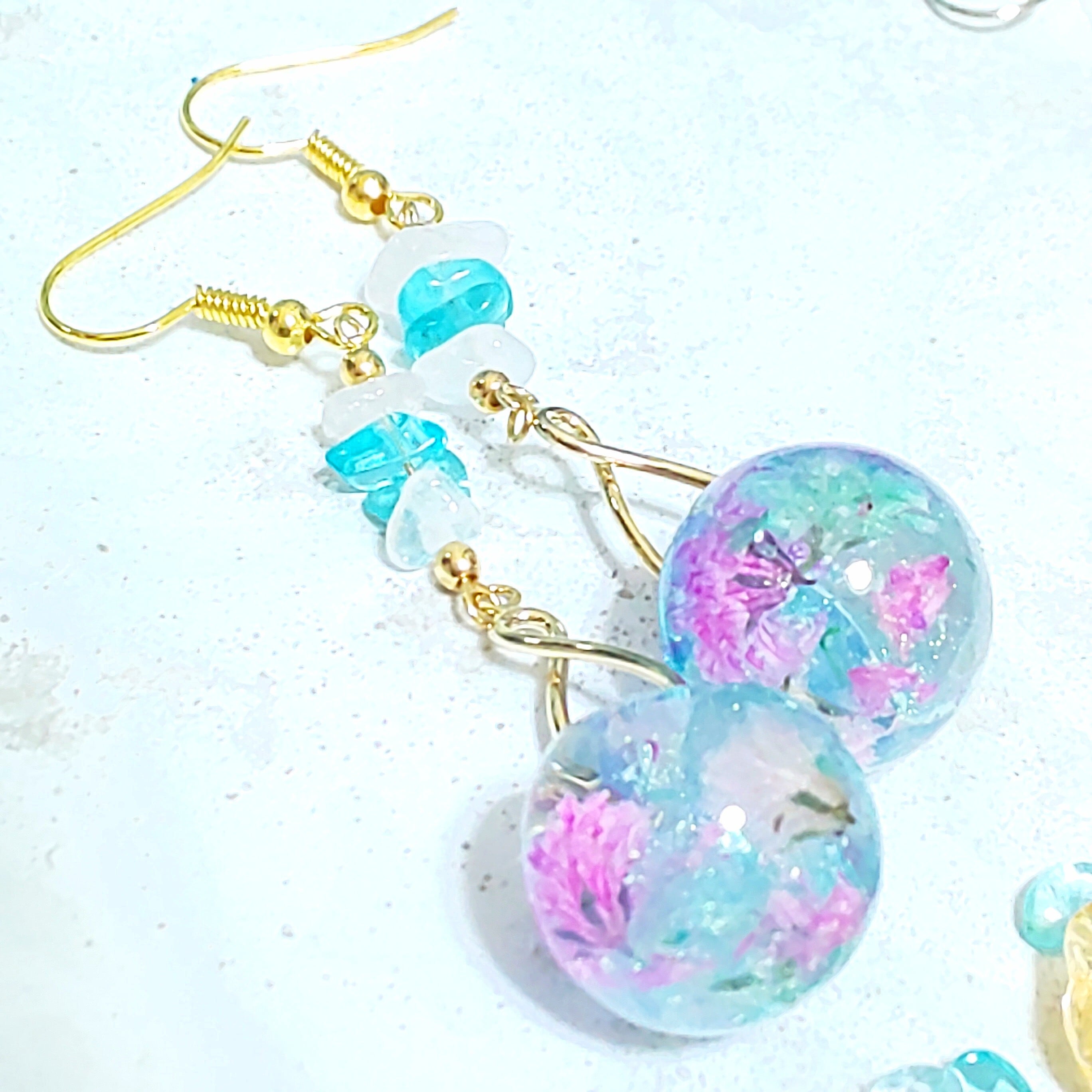 淡い空色や鮮やかなピンク等のかすみ草をレジンで閉じ込めております。