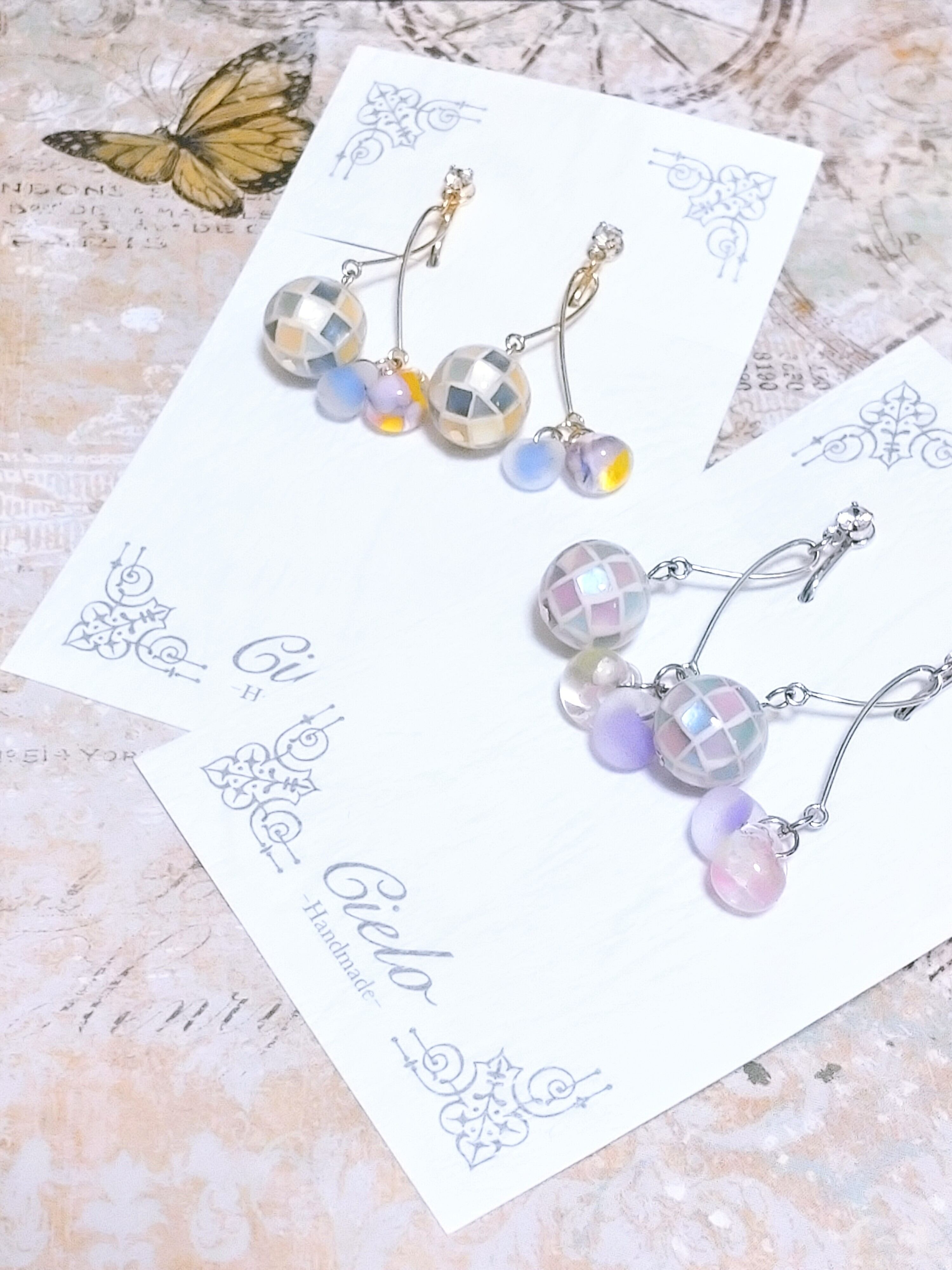 ひとつひとつのシェルパーツが優しい色味で彩られ、揺れるたびに柔らかな光を放ちます。さらに、ドロップビーズが上品な輝きをプラスして、耳元を華やかに飾ります。